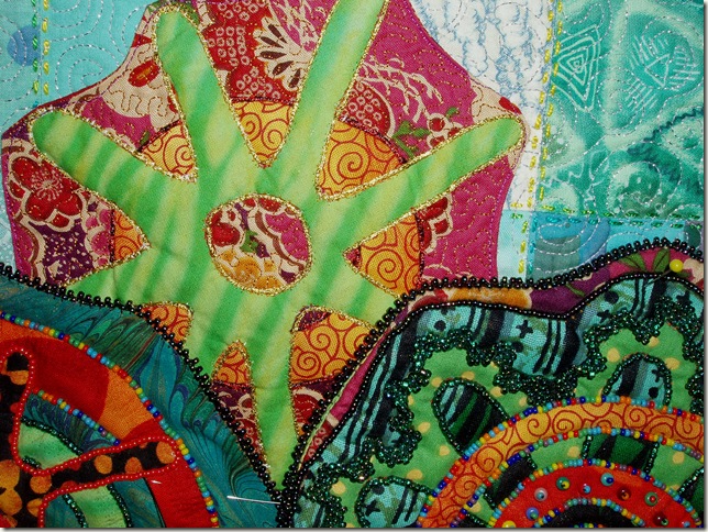Here you can see the circle quilting in the Kreinik Silver Gimp Thread in “Gold”. I initially quilted both corals with Madeira thread in a shade of orange, and I really like how going over the quilting with the metallic thread added depth to the piece.